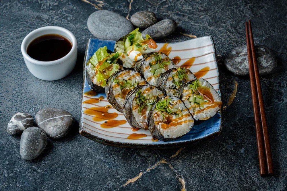 Лосось с рисом, сливочным сыром, листовым салатом, свежим огурцом и соусом терияки, завернутый в водоросли нори.