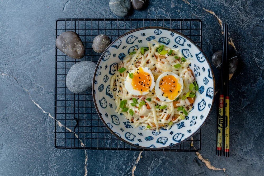 Нежные рисовые палочки с ветчиной в сочной обжарке из овощей в соусе на выбор. Состав: Рисовые палочки, сыр моцарелла, ветчина, болгарский перец, морковь, зеленый лук, яйцо варенное, кунжут, соус на выбор.