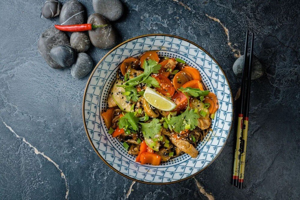 Пряная гречневая лапша с курицей и хрустящими овощами, обжаренная в терияки соусе.