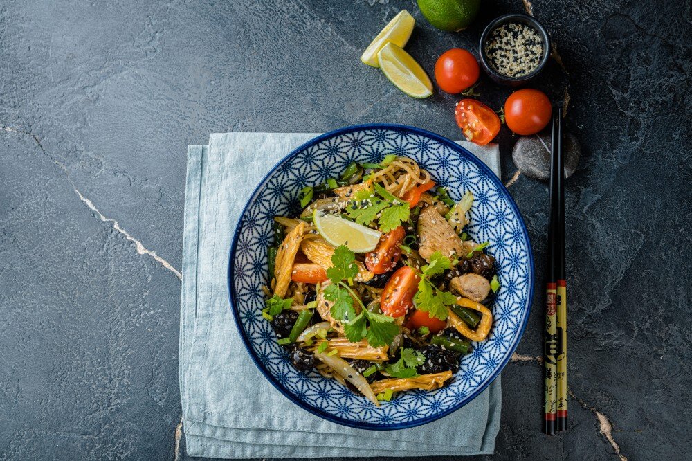 Состав: лапша лимак, куриное филе, спаржа, фасоль, грибы муэр, лук репчатый, перец болгарский, лайм, черри, зеленый лук, кинза и кунжут.