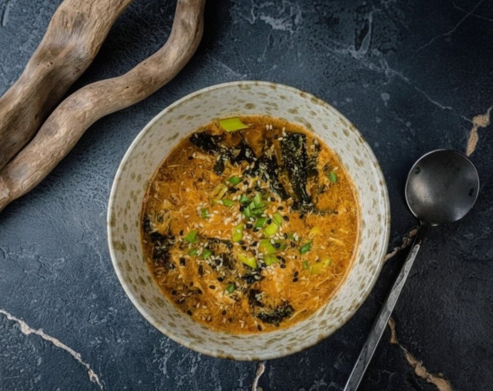 Суп на основе соевой пасты с добавлением яйца, водорослей вакамэ, кунжутного масла, репчатого и зеленого лука. Умеренно острое блюдо