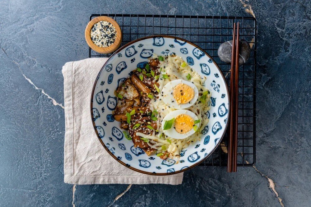 Нежные рисовые палочки с хрустящими овощамипод соусом Чачжан. Состав: Рисовые палочки, сыр моцарелла, соус Чачжан, морковь, капуста, яйцо вареное, зеленый лук, кунжут.