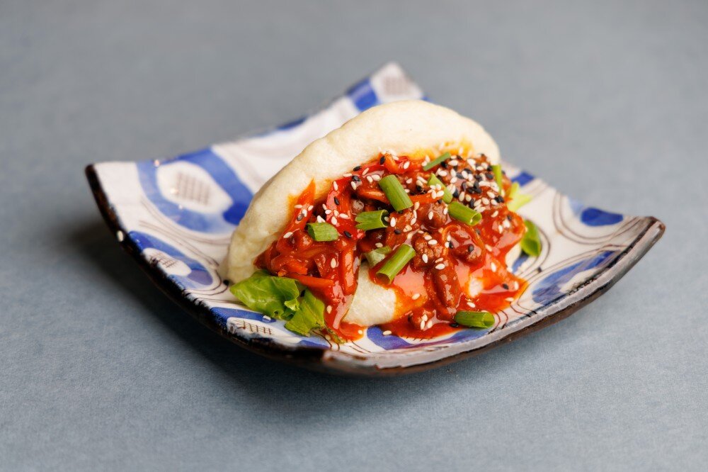 Нежная булочка бао, наполненная говядиной в соевом соусе и свежими овощами. Состав: тесто, говядина в соевом соусе, лук репчатый, морковь, болгарский перец, соус яннем, кунжут, зеленый лук, лист романо.