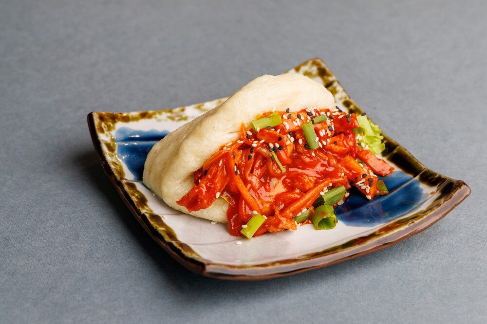 Мягкая булочка бао с сочным куриным бедром, свежими овощами и острой заправкой яннем. Состав: тесто, куриное бедро, морковь, репчатый лук, болгарский перец, соус яннем, кунжут, зеленый лук, лист романо.
