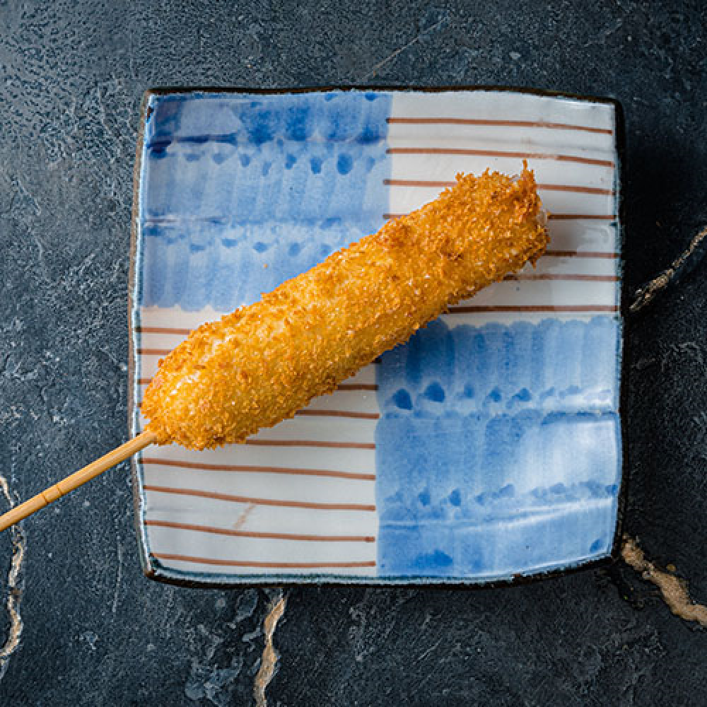 Корн-дог с мясной сосиской и сыром, обжаренный в хрустящей панировке, с соусом на выбор
