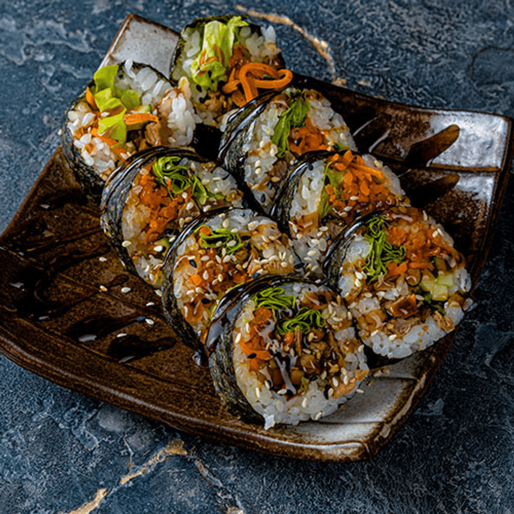 Рис, говядина в соевом соусе, морковь Тангын Че, водоросли нори, огурцы, салат и соус терияки