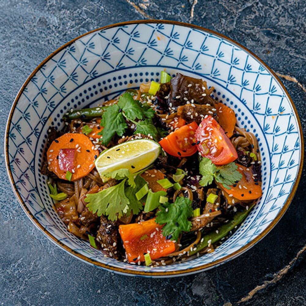 Лапша гречневая, курица, перец болгарский, морковь, лук красный, цукини, грибы шампиньоны, терияки соус