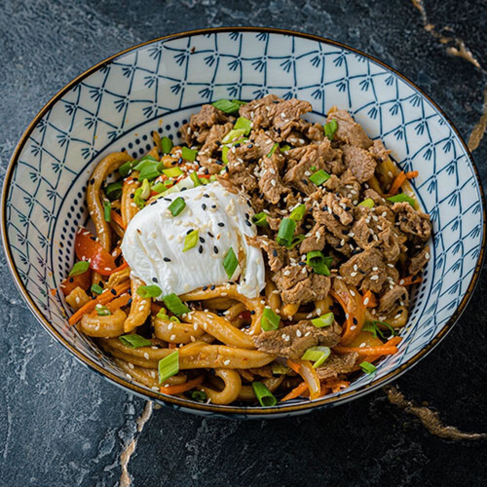 Жареная домашняя лапша с говядиной, овощами, грибами и яйцом пашот