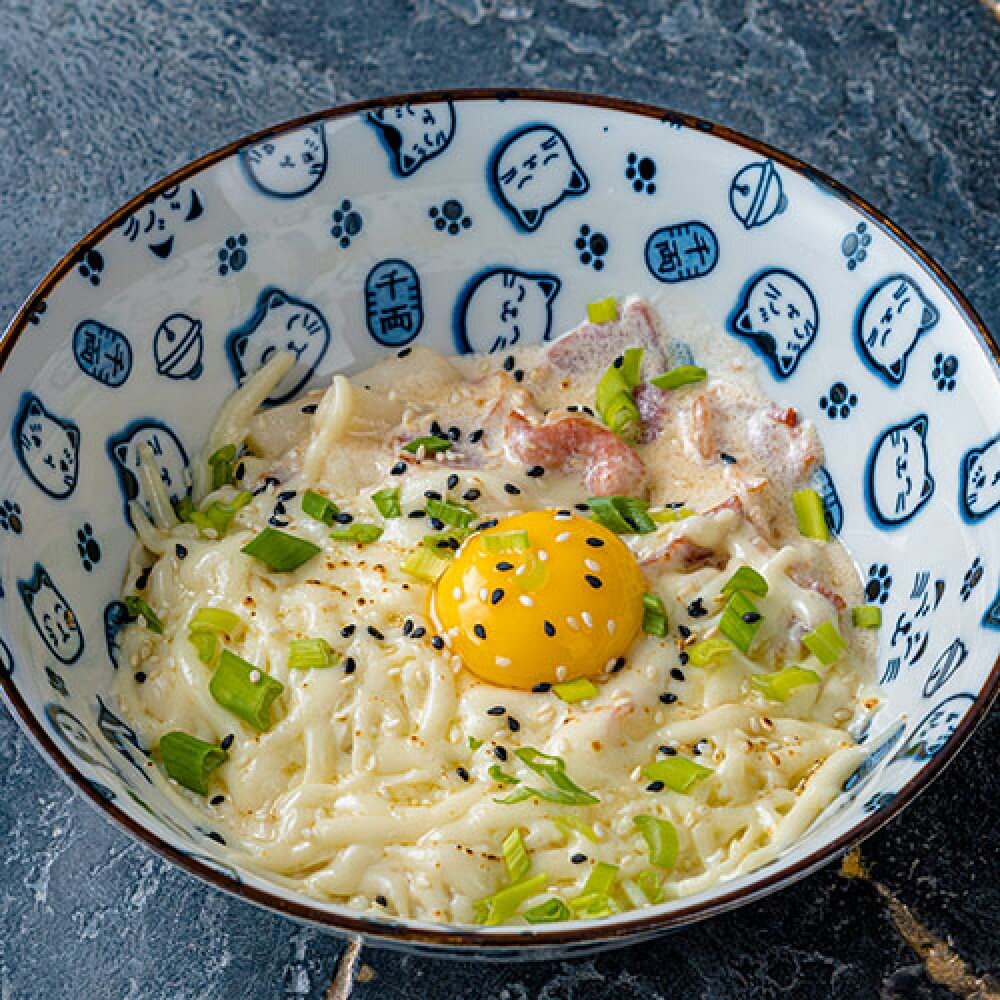 Нежные рисовые палочки под сливочном соусом с хрустящим беконом, яичным желтком и сыром моцарелла