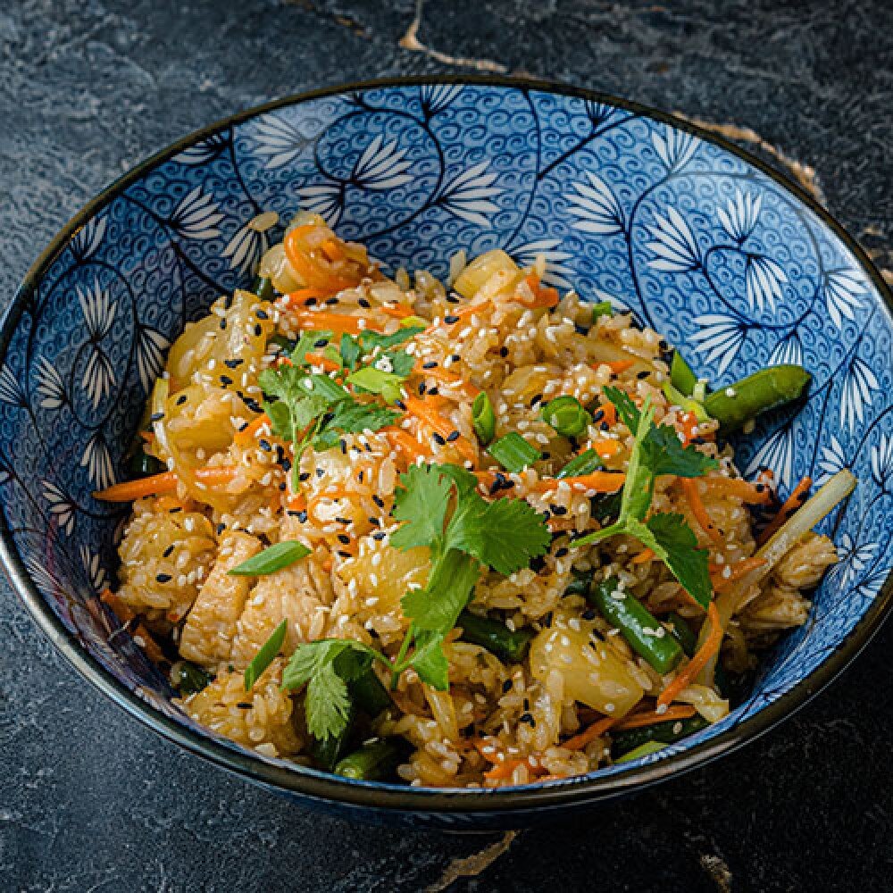 Жареный рис с курицей, ананасами, овощами и сладким соусом чили