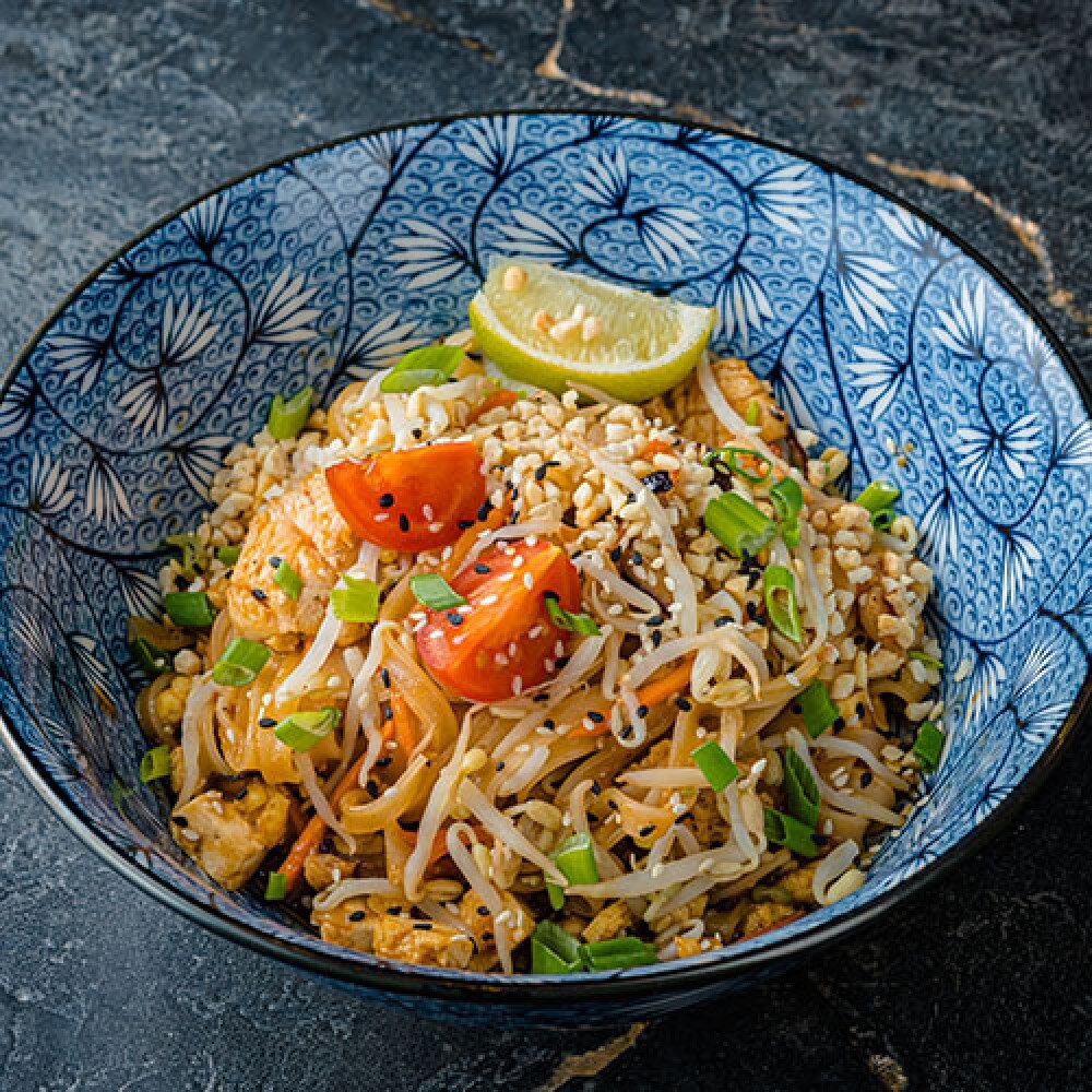 Рисовая лапша с курицей в пряном тайском соусе с проростками маша и крошкой арахиса