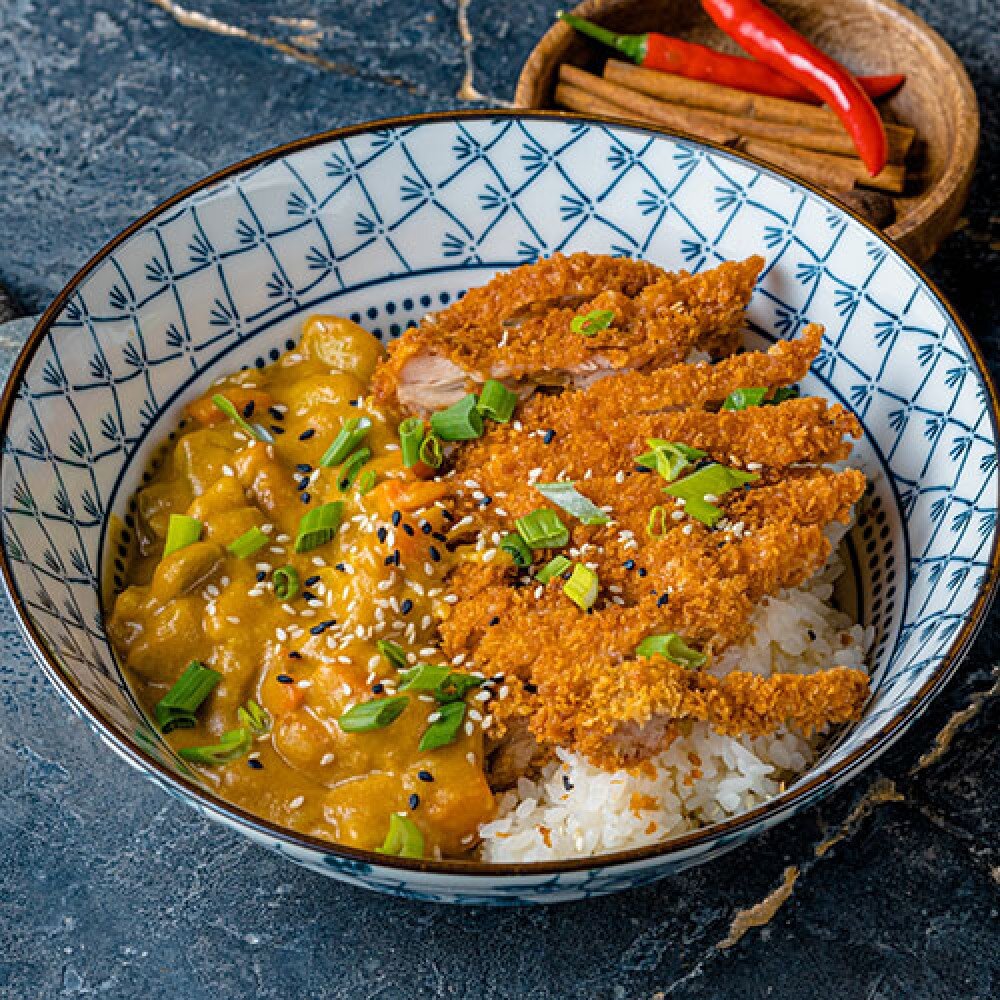 Кусочки куриного бедра, обжаренные сухарях панка с овощами в соусе Карри. Подаются на паровом рисе