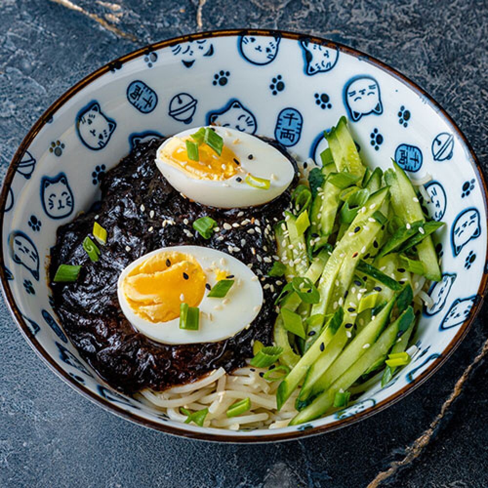 Лапша со соусом из ферментированных чёрных Ббобов со свининой. Подается со свежим огурчиком и варёным яйцом