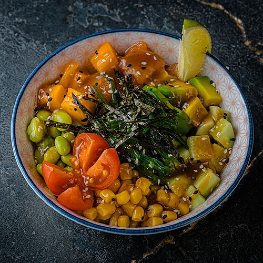 Рис, лосось маринованный, бобы эдамамэ, кукуруза, сезонный фрукт, салат щчука, авокадо, огурцы, помидоры черри, лайм и соус понзу