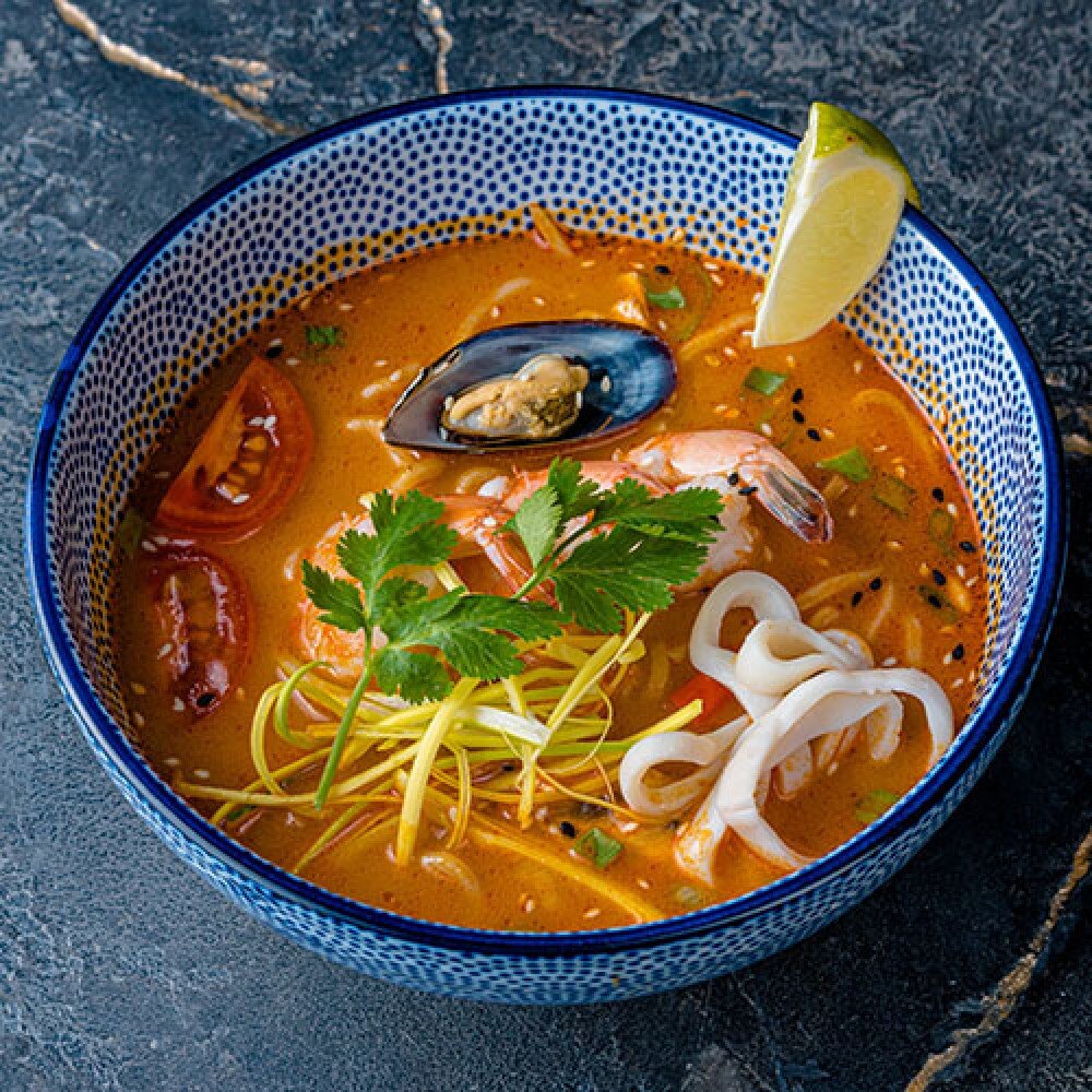 Тайский суп с домашней лапшой или рисом, морепродуктами, черри, зеленью и кокосовым молоком, с такуаном