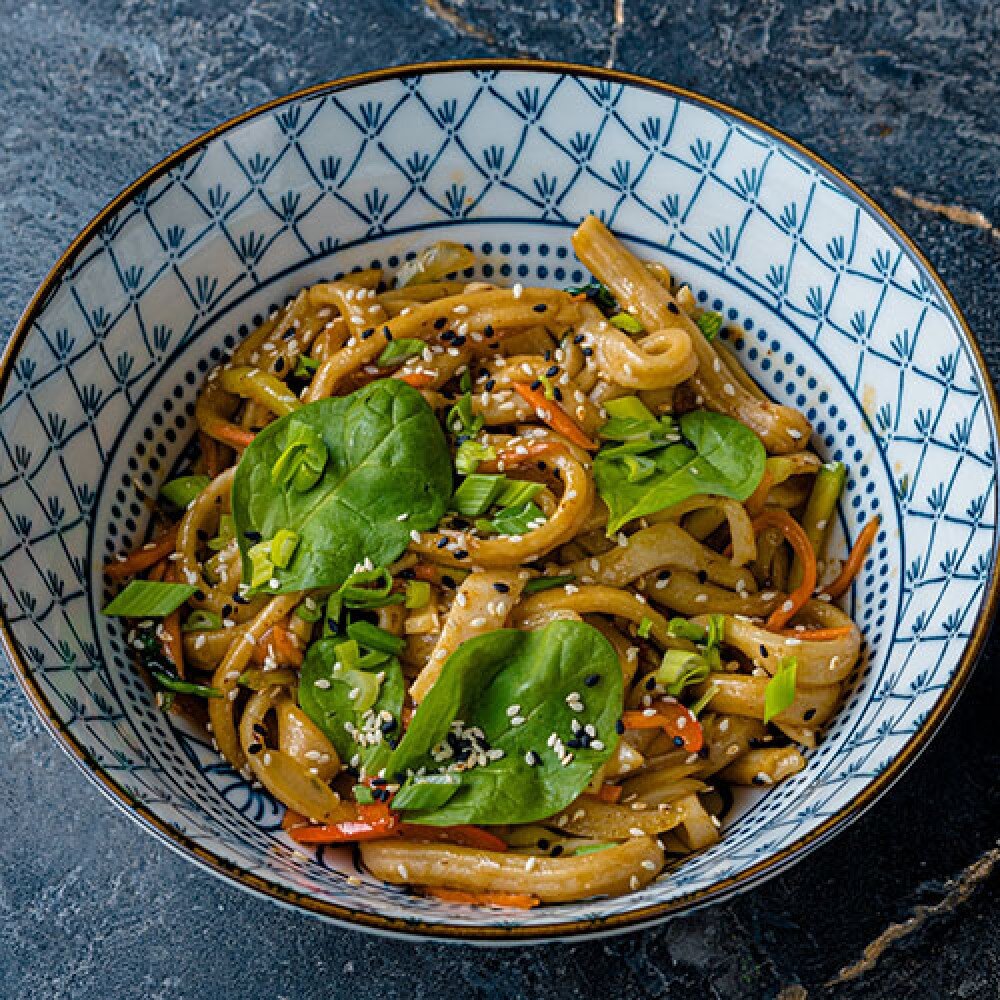 Лапша с кальмарами, овощами, свежей зеленью под устричным соусом