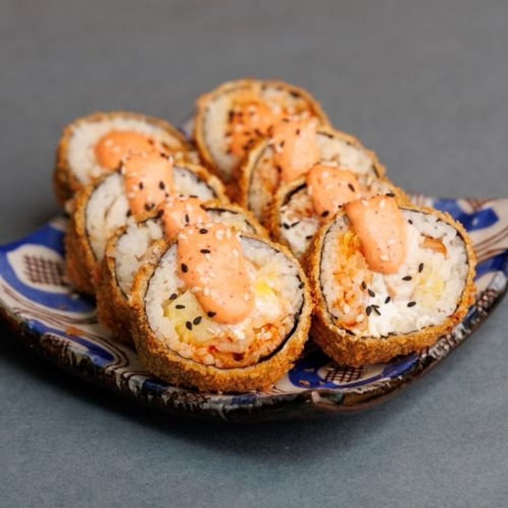 Золотистый ролл с сочной тигровой креветкой,свежими огурцами,сливочным сыром, салатом из моркови(Тангын Че) и спайси соусом. Состав: Рис, Нори,креветка тигровая отварная,огурцы, тангын че, соус спайси.