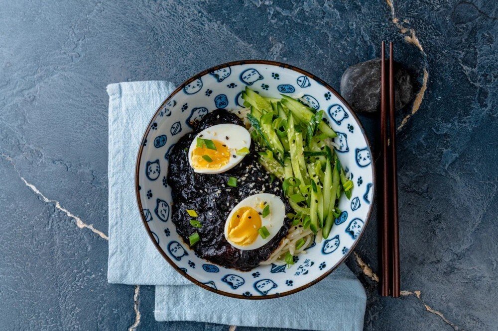 Лапша с соусом из черных бобов и свининой. Подается со свежими огурцами и с яйцом.