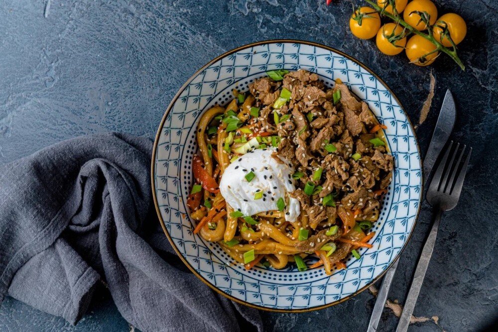 Жареная домашняя лапша с говядиной в соевом соусе, капустой кимчи, овощами, грибами, и яйцом пашот.