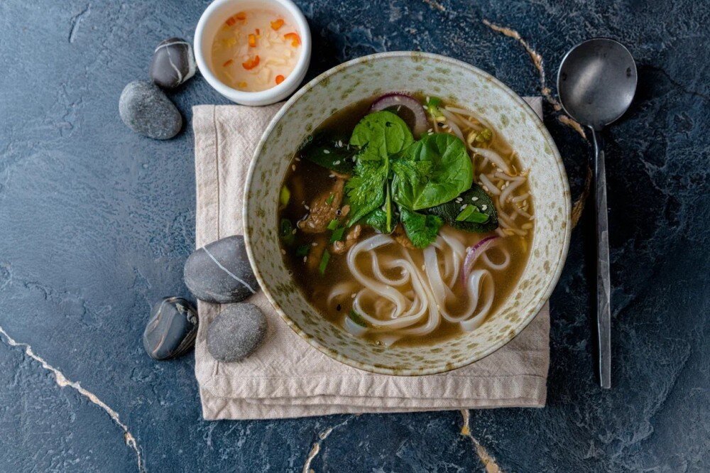 Традиционный вьетнамский пряный суп. Состав: Бульон фо бо (говядина, специи, овощи, зелень), рисовая лапша, говядина, проростки сои, масло из черных соевых бобов, зелень, маринад (перец чили, чеснок).