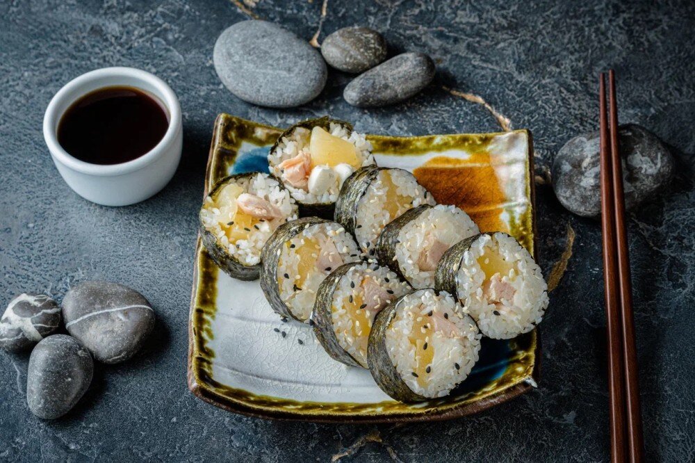 Ролл с начинкой из сочной курицы, консервированного ананаса и сливочного сыра