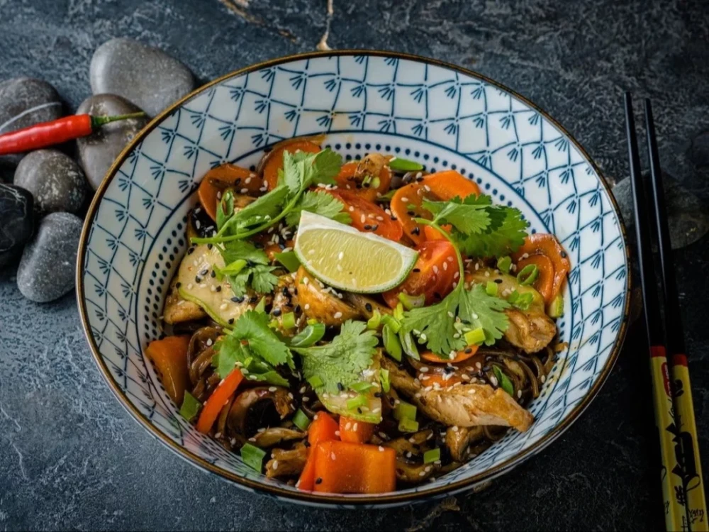 Пряная гречневая лапша с курицей и хрустящими овощами, обжаренная в терияки соусе.