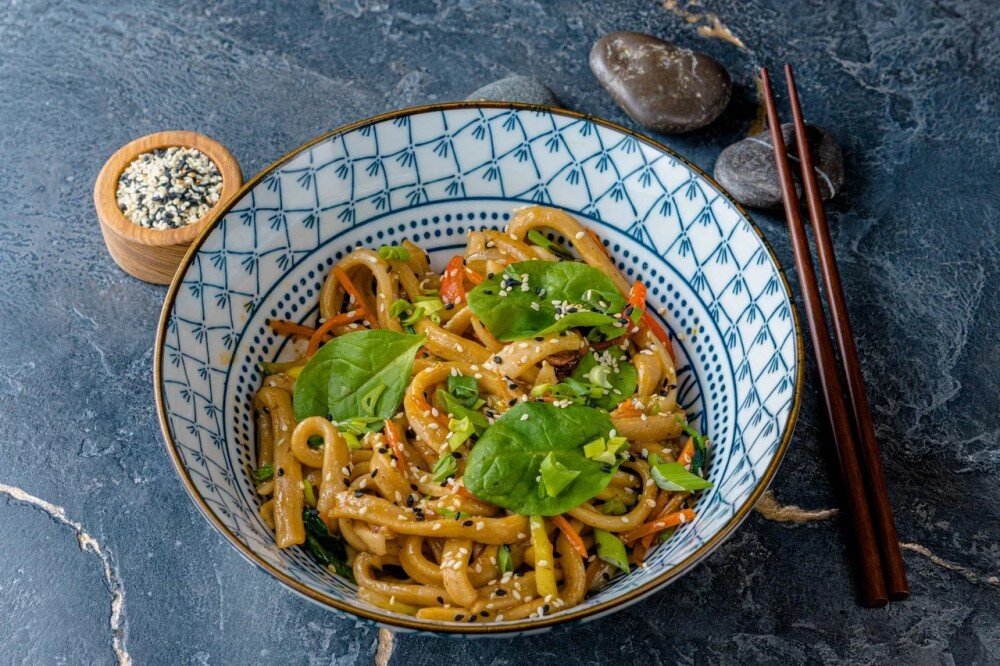 Состав: Кальмар, лук, морковь, перец болгарский, масло растительное, кунжут, лук зеленый, шпинат бэйби, соус устричный, цуккини, лапша удон.