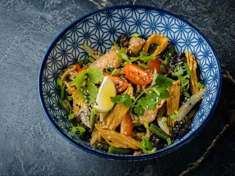Нежная домашняя лапша с курицей, спаржей, хрустящими овощами и грибами муэр.
