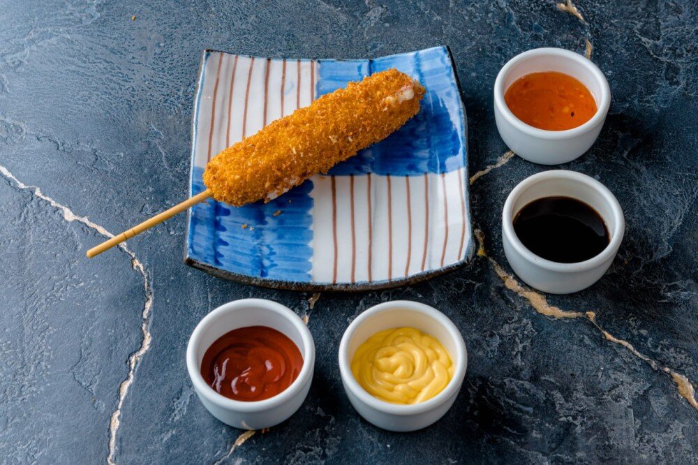 нежный сыр моцарелла на палочке, обжаренный в хрустящей панировке, с соусом на выбор