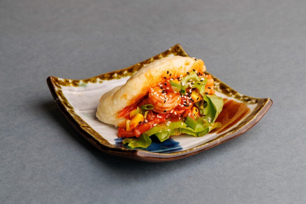 Воздушная булочка с нежной креветкой, овощами и сладкой кукурузой. Состав: тесто, креветка, консервированная кукуруза, репчатый лук, морковь, болгарский перец,соус яннем, кунжут,зеленый лук, лист романо