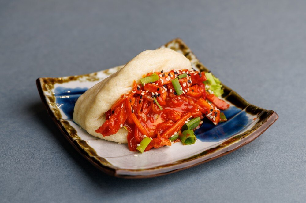 Мягкая булочка бао с сочным куриным бедром, свежими овощами и острой заправкой яннем. Состав: тесто, куриное бедро, морковь, репчатый лук, болгарский перец, соус яннем, кунжут, зеленый лук, лист романо.