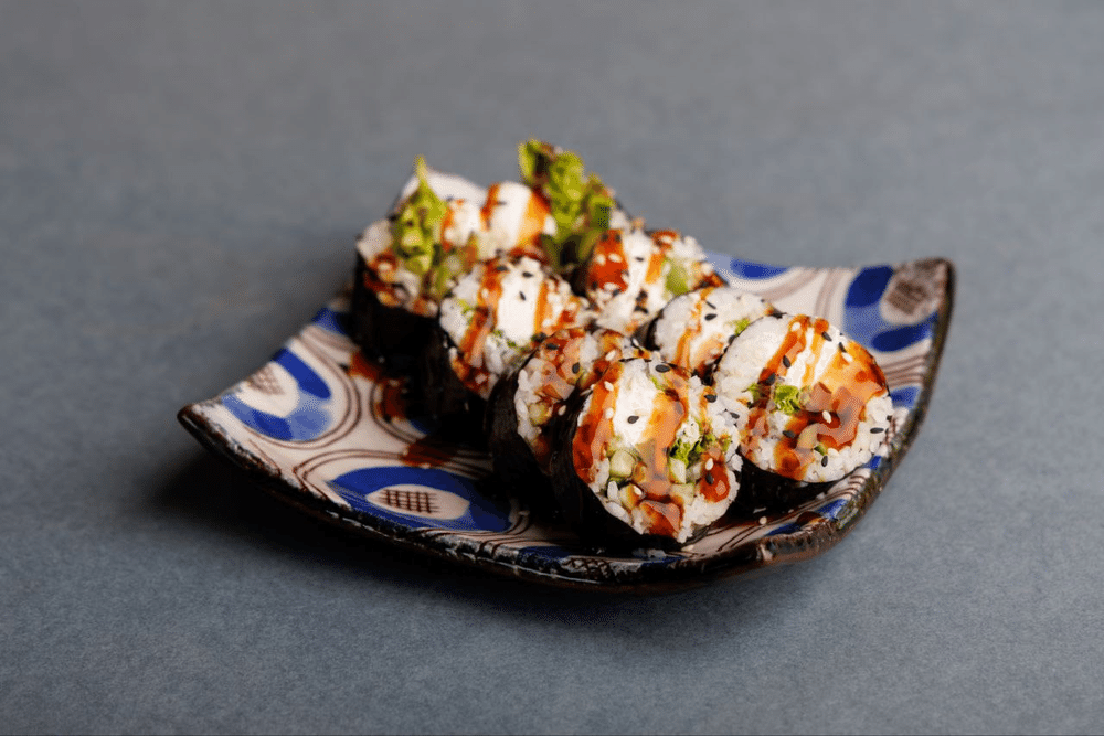 Хрустящий огурец с рисом и нежным сыром креметте, завернутый в водоросли нори. Состав: огурец, салат, сыр креметте, рис, нори