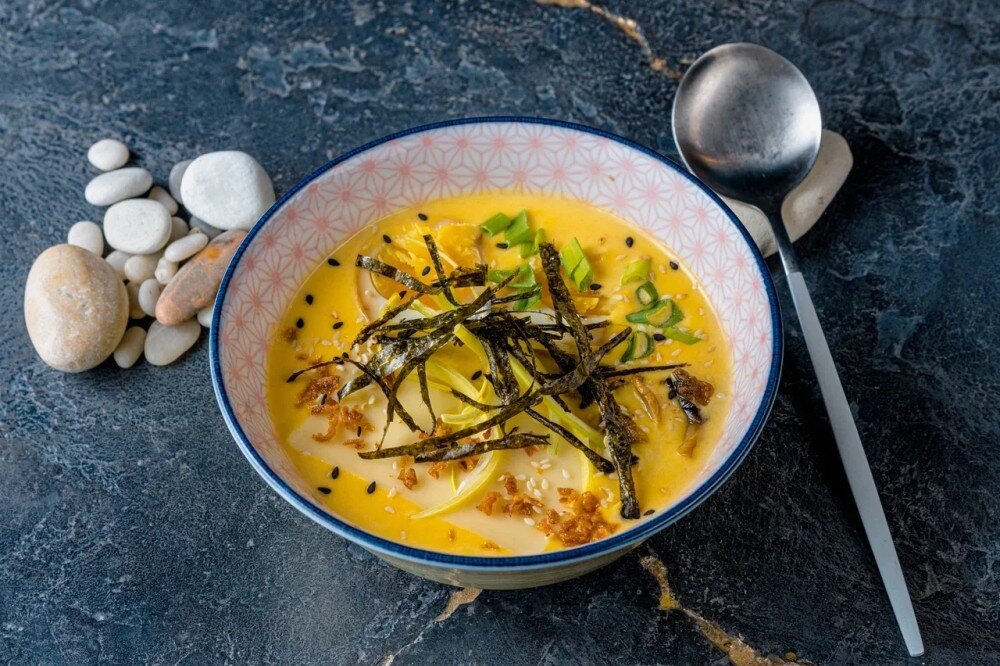 Сырный крем-суп с домашней лапшой. Состав: Сырный бульон, домашняя лапша, сыр моцарелла, яйцо маринованное, нори, грибы шампиньоны, жаренный лук.