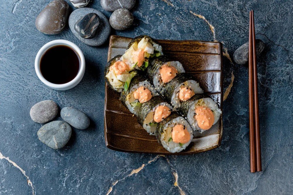 Тунец с рисом, свежим огурцом, нежным омлетом, маринованным дайконом и спайси соусом, завернутый в водоросли нори.