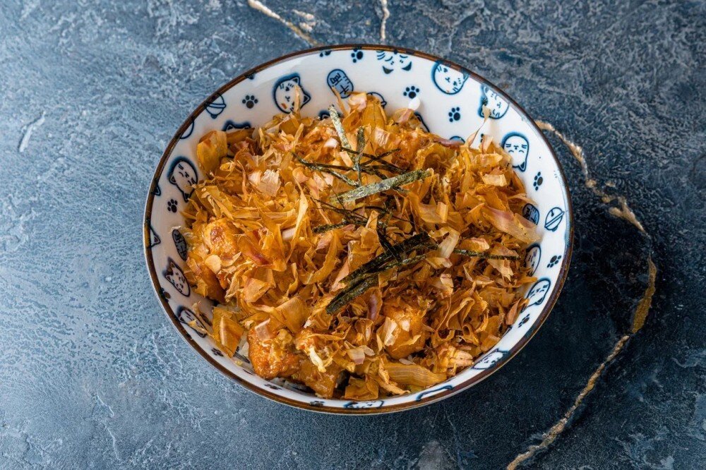 Куриное бедро тушеное с луком в соусе оякодон, затянутое в яйце, подается со стружкой тунца на подушке из риса.