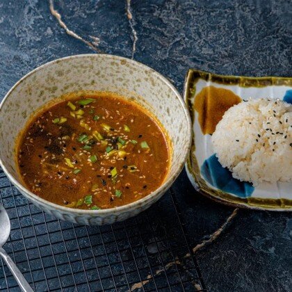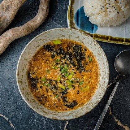Состав: Бульон даси (стружка тунца, хандаши, паста мисо), сыр тофу, водоросли вакамэ, грибы намеко, лук зеленый.