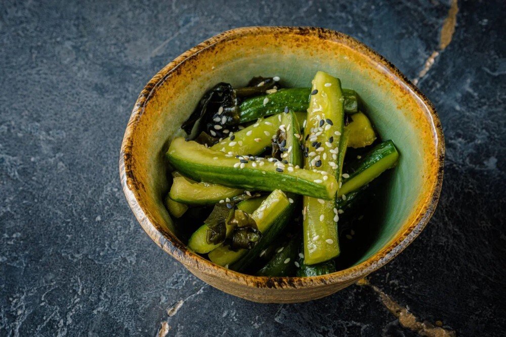 Салат из маринованных огурцов. Хрустящие огурчики в специях. Состав: Огурцы, чеснок, соль, соевый соус, масло кунжутное, кунжут, уксус рисовый, водоросли вакамэ, сахар.