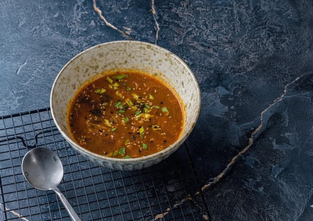 Традиционный острый корейский суп с кимчи, бататовой лапшой, тофу, ростками маша, вакамэ и кинзой.