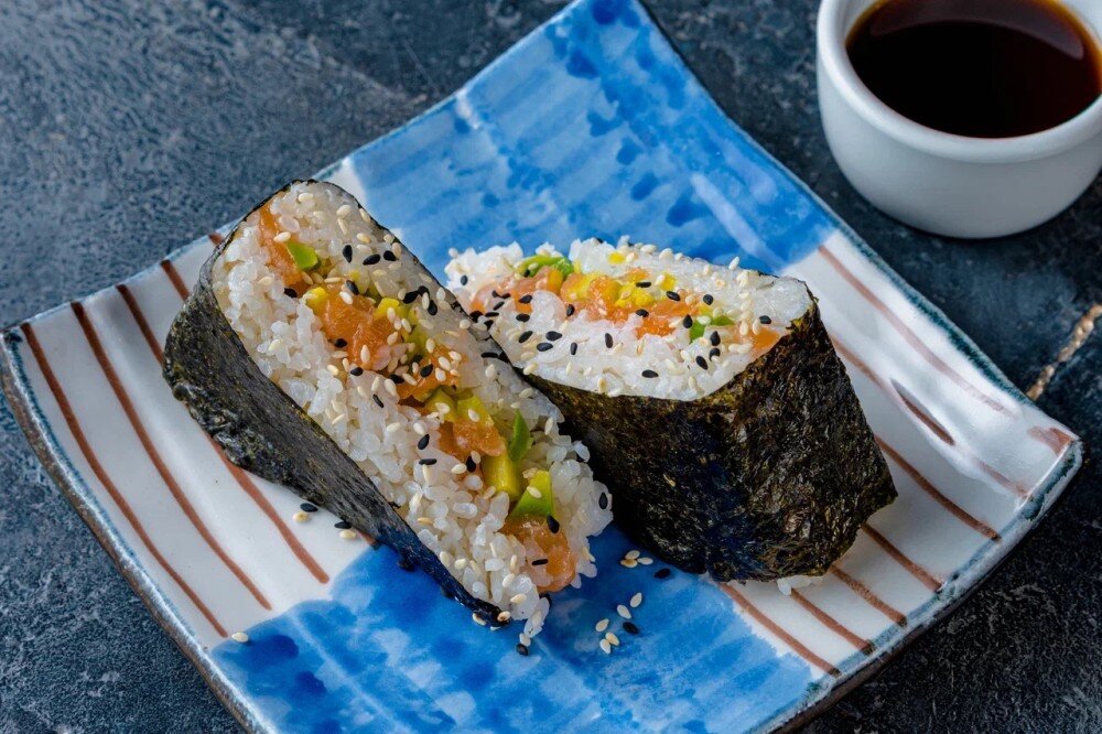 Рисовые треугольники с начинкой из лосося и авокадо.