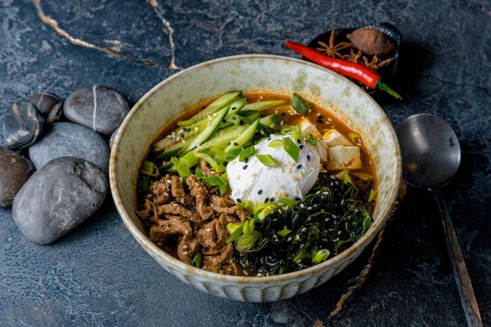 Острый суп с домашней лапшой и говядиной на основе бульона кимчи.